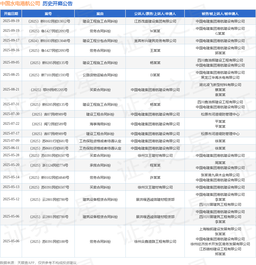 根据统计,近一年内以中国电建集团港航建设有限公司为当事人的历史开庭公告有37则,其中案由为“建设工程施工合同纠纷”的公告以8则居首,其次为“劳务合同纠纷”有5则,“建筑设备租赁合同纠纷”有4则。历史开庭公告(前20条)如下: